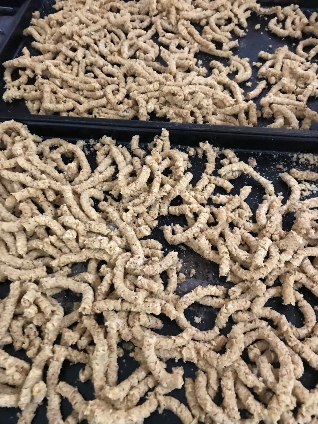 I have found it easier to use my meat grinder, however. ( actually my daughter Megan came up with the idea!). I take out the blade and use the disk with the largest holes. Put them through the machine and cut them at about 2 inches in length.