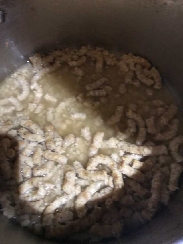 Combine bread crumbs, lemon zest, ground nutmeg, cheese, salt, and pepper ( more than a little!). Make a well. Add eggs, scrambled, and mix into a loose ‘dough’. Add milk as you mix to get the consistency – it should stick, but not too tightly.