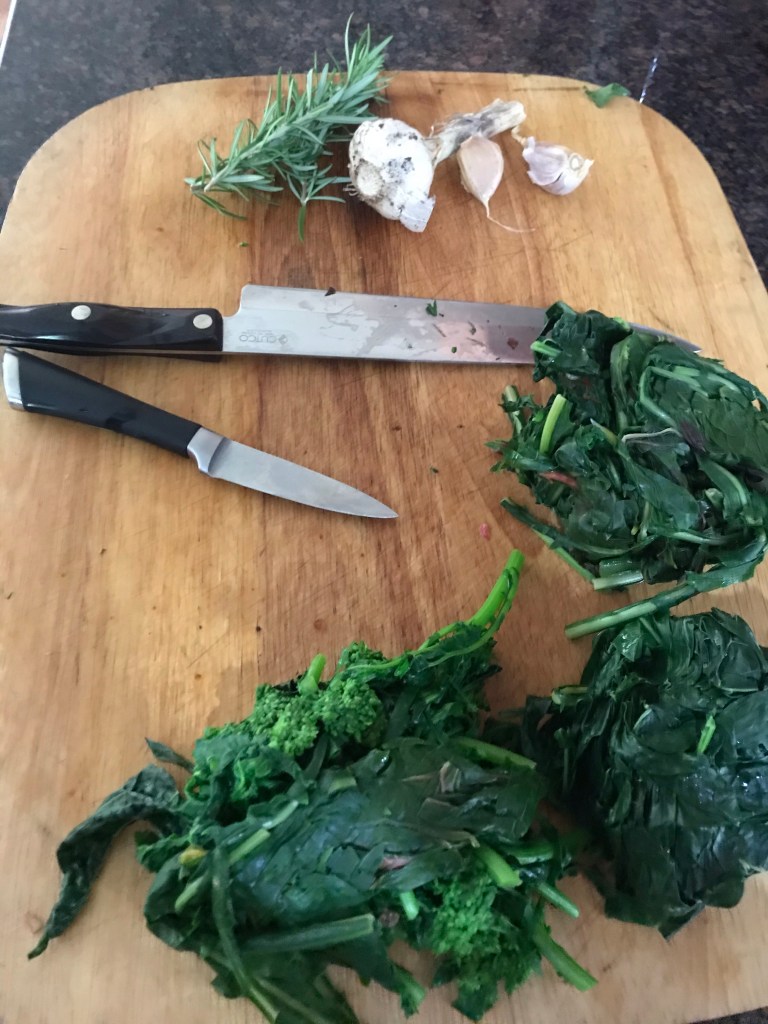 4. In a large sauté pan, heat enough olive oil to cover the bottom. Chop your salt pork fine and cook Over med- low heat. You want the fat to melt into the oil. If using pancetta or the others, brown them. Chop about 4 good sized cloves of garlic. Turn down hear to low. Then add them and cook for about 30 seconds. DO NOT LET THEM BROWN. Add greens and 3 good sized sprigs of rosemary. Some like to remove the leaves from the stalk and chop the rosemary. I just throw them in and remove the stalks when the dish is finished. Add salt, pepper, and red pepper flakes/ chili peppers to taste. Cook covered, low heat, for about an hour, stirring occasionally. You will have to add more olive oil. My Nona always said you cannot skimp on the oil in this dish.