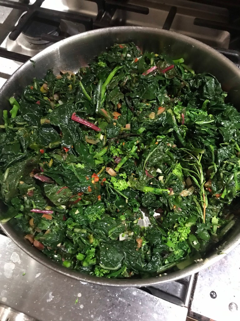 Greens: any combination of kale, Swiss chard, spinach, dandelion greens, broccoli raab, turnip greens, radicchio, beet greens, arugula,… pretty much whatever you have. My sister likes to use broccoli and cauliflower florets.