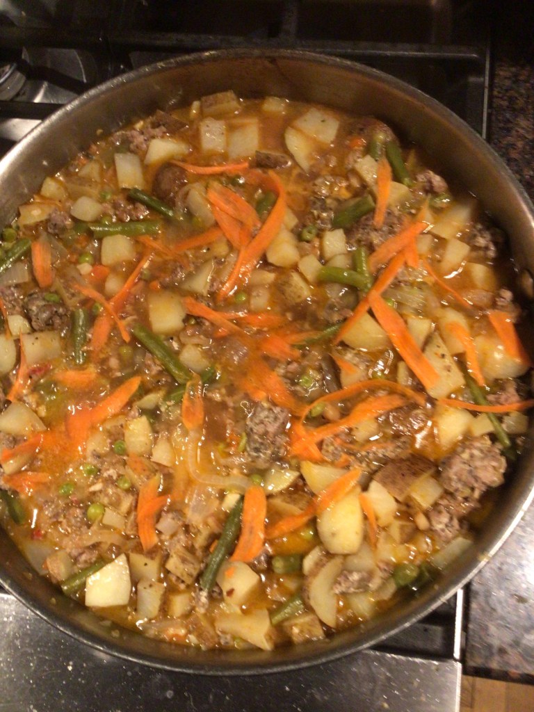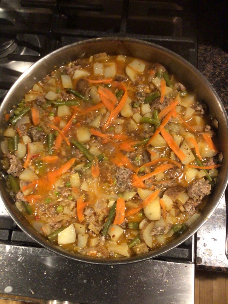 6. Turn down to low. Dice potatoes and add to pan. Sliver carrot with a peeler and add it. Add broth. Simmer slowly about 45 minutes, covered.