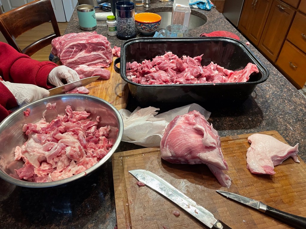 * Note- pork butt is actually a part of the shoulder. They are sold bone in or boneless. Boneless is easier- but if you have the butcher bone them for you, keep the bones. They are great for sauce and soups.