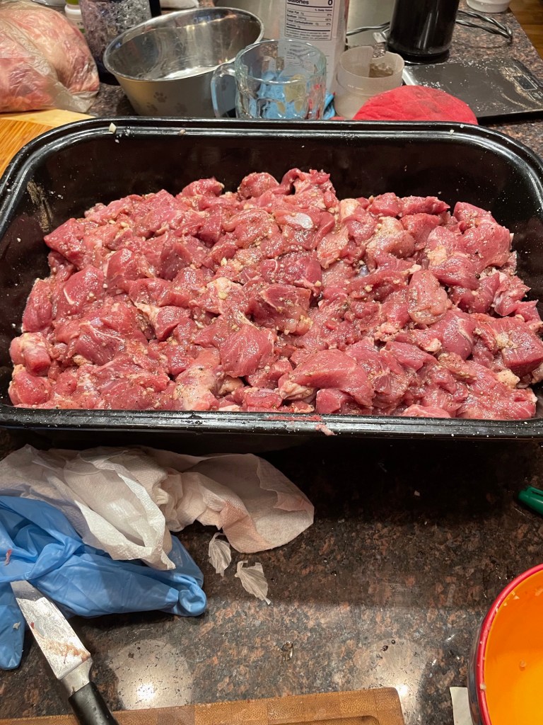 2. Trim the pork to 1 inch cubes. Trim off the stringy fat, but keep the solid fat. You have to have the fat in them or they will be dry and less flavorful. Remove any veins or glands.