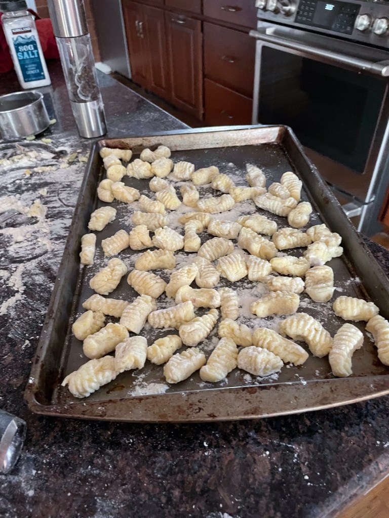 4. Boil in salted water until they begin to turn over ( a few minutes). Serve with marinara, meat sauce, butter and sage, or any sauce you choose.