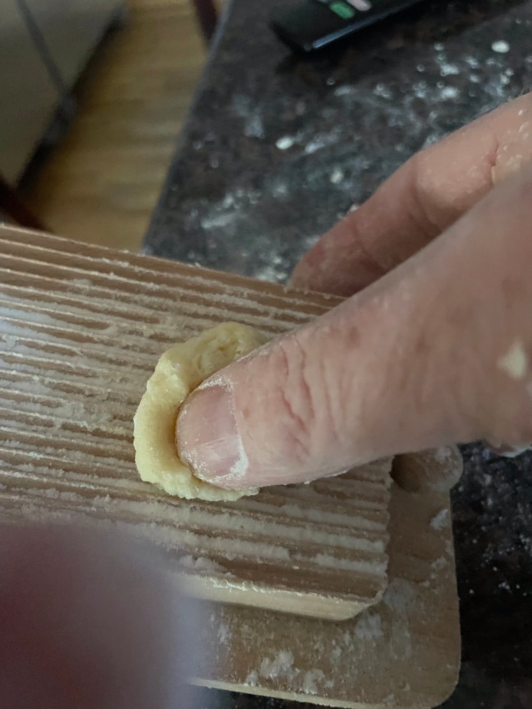 3. Beat in eggs. Using your hands, work in the eggs until a ball forms. Cut into chunks, roll in snakes. Cut roll into 1 inch pieces and roll off a fork or a gnocchi board. Repeat.