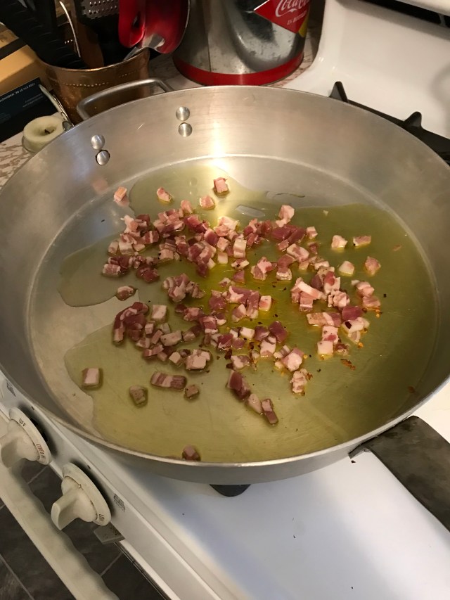 3. Chop salt pork/ pancetta finely. Let it brown in a large pan of olive oil. You want the fat to melt. Add pepper and red pepper flakes.