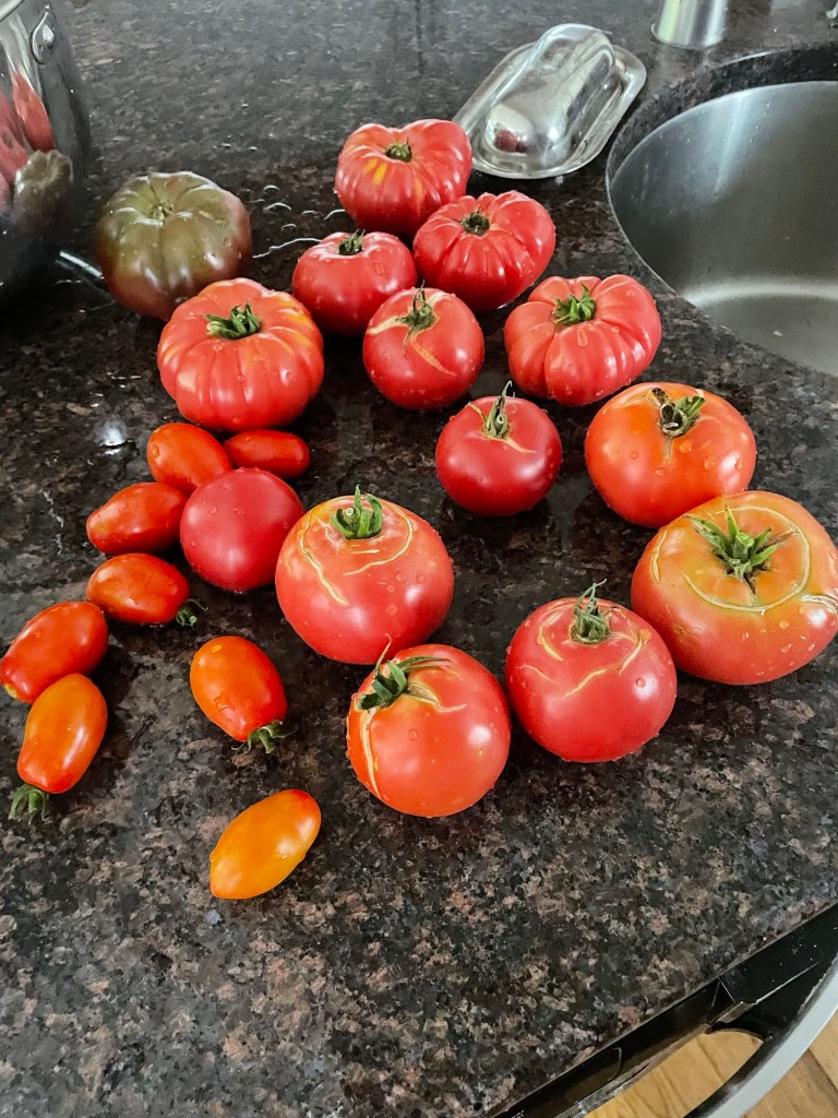 I find that my heirloom slicing tomatoes are way too juicy for sauce. I grow paste tomatoes for that. I had a big bunch, and I didn’t want them to just rot. So… tomato soup.